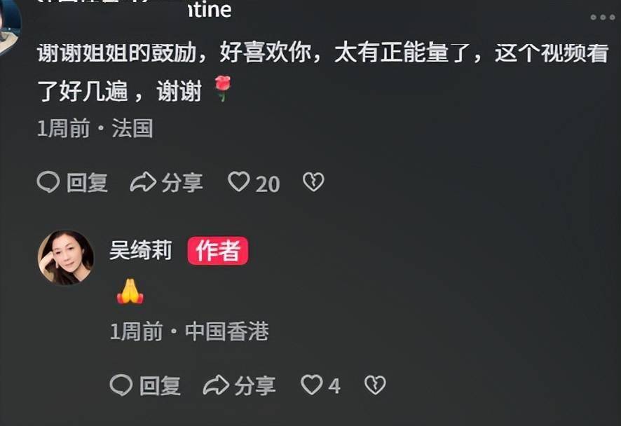 有网友感谢她,称从她的这番话中受到了鼓励,她也暖心挑出了网友的留言进行回复。