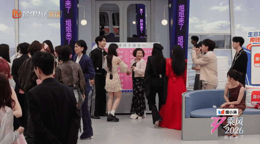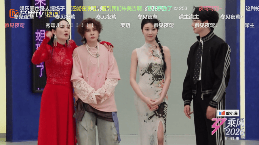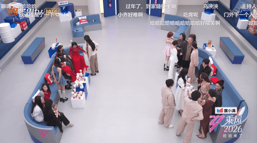 《乘风2026》的直播实验,某种程度上确实打破了传统综艺的剪辑滤镜,带来“活人感”和话题热度,但也被不少观众吐槽冗长乏味,看得好累。万千惠和三宝夫妻出场时,弹幕里全是“字幕呢”“这是谁”。黄灿灿提及自己曾“假唱”,主持人连忙捂嘴修饰为“以表演为主”,仿佛事故现场。缺乏调控的流程也引发质疑“有必要一个人聊这么久吗”。当后续嘉宾未能准时出场,大家只能到处闲聊,现场闹哄哄一片。有人觉得能看到明星真实的工作应酬场面,也有人吐槽“跟村子里开了席似的”“好像在看农贸市场的监控录像”。