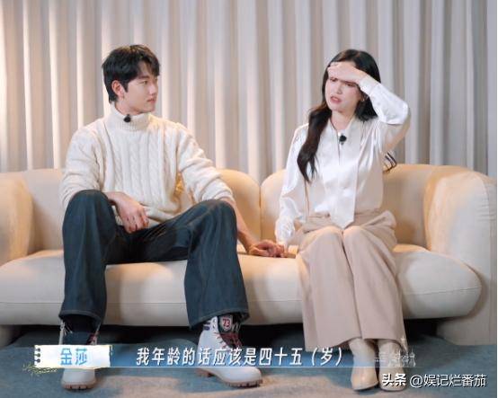 45岁的金莎不自信了,说年龄时,支支吾吾的,然后摸额头的小动作来了。