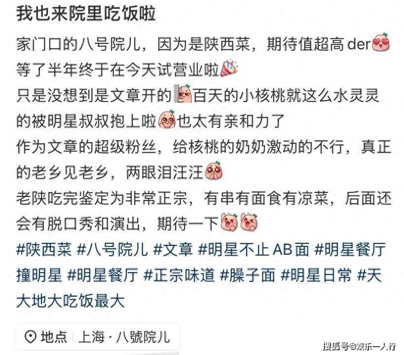 多位食客在社交平台晒出的照片和视频显示,文章频繁以店员身份出现在餐厅里。他穿着印有店名的统一工作T恤,胸前挂着一副被网友调侃像“老花镜”的眼镜,亲自负责迎客、点单、送餐,甚至解答顾客对菜品的疑问。有粉丝认出他喊了一声“文导演”,他先是愣了一下,随即就热情地笑着打招呼,还对着手机镜头挥手。现场顾客形容他“像普通餐厅老板,完全没有明星架子”,全程保持微笑,对合影要求来者不拒。