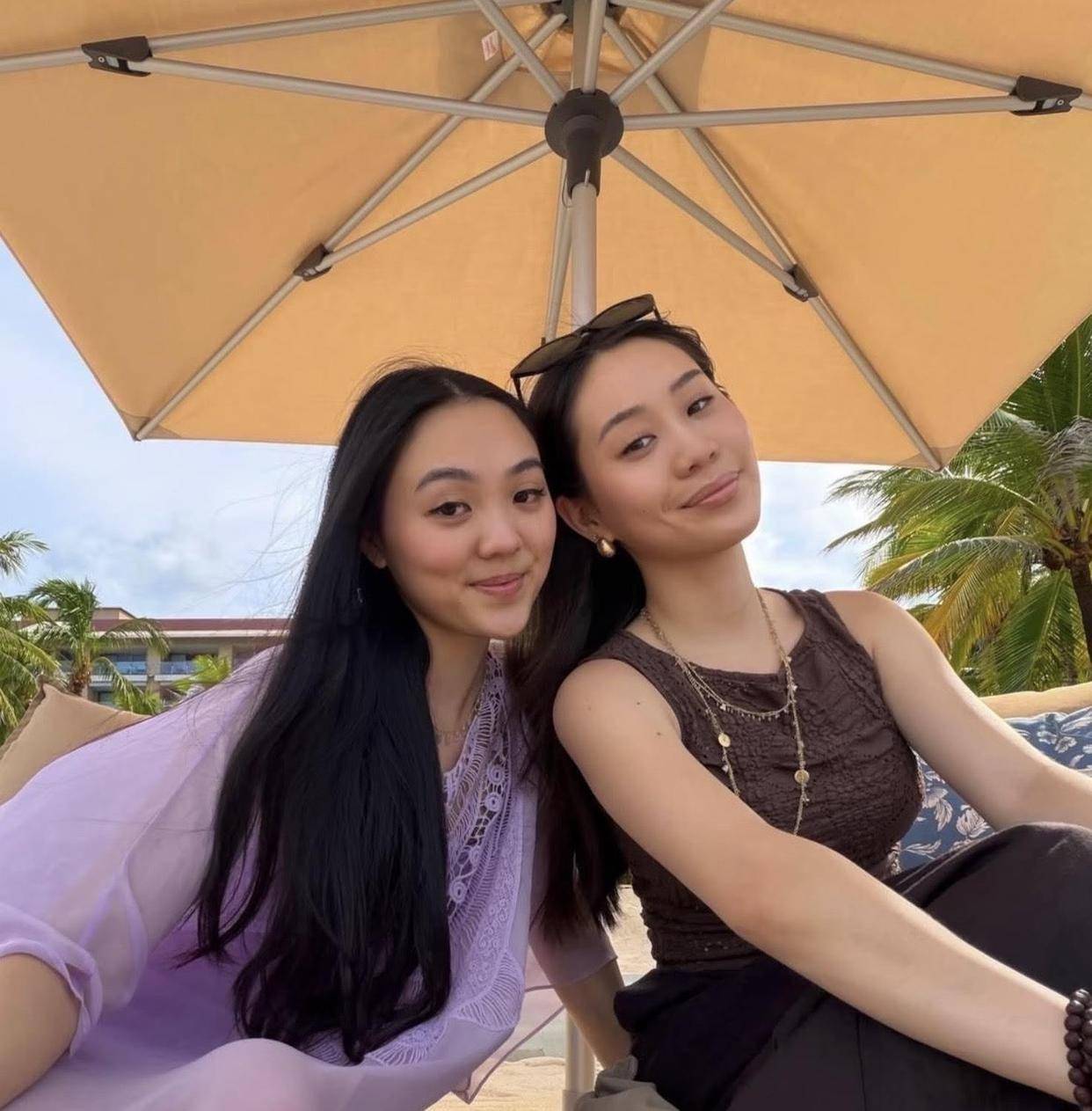 姐姐Jane专程从美国飞往巴厘岛,陪妹妹庆祝。 两人在海边沙滩的遮阳伞下拍了合照,Jane穿着紫色长裙,Jada穿着褐色长裙,胸前挂着金链子,戴着太阳镜。