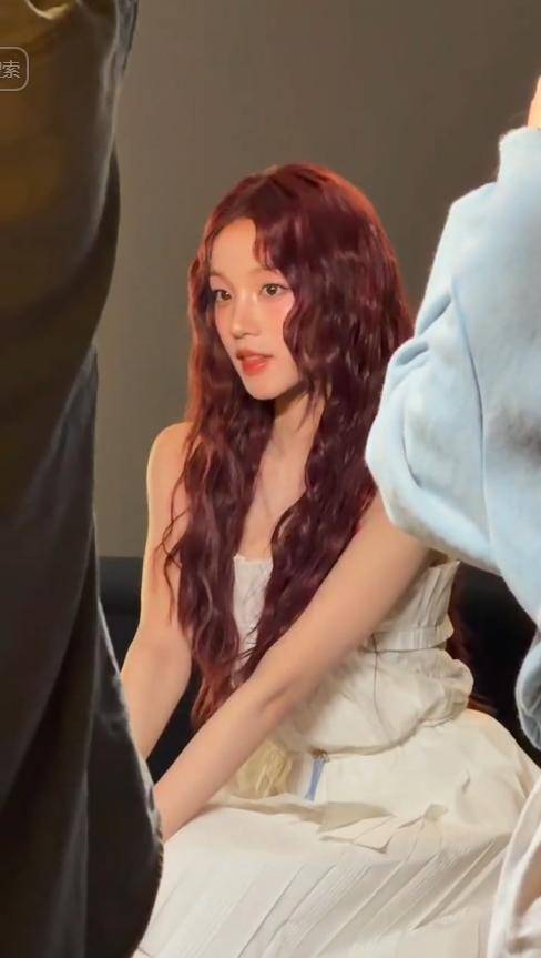 她留着一头酒红色的羊毛卷,衬得皮肤白到发光,和裙装形成鲜明撞色,复古又有元气。