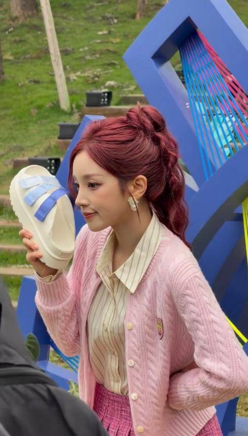 一身粉色针织衫配短裙,层层褶皱轻盈又灵动,收腰设计刚好勾勒出纤细的腰肢,小腿袜细节低调又精致。