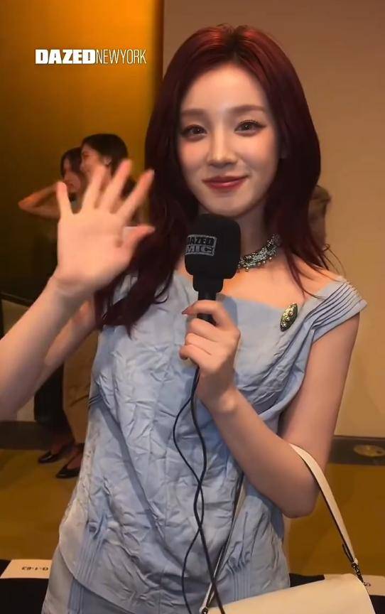 之前纽约时装周上,她穿淡蓝色短裙亮相,甜美又知性,还获得了官方直播的首个特写镜头,国际影响力可见一斑。