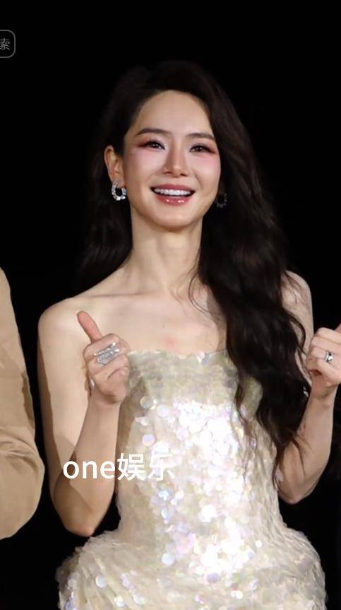 一身香槟色亮片长裙,缀满细密珠片,灯光下流光溢彩,完美勾勒出她的身材曲线,搭配波浪长卷发。
