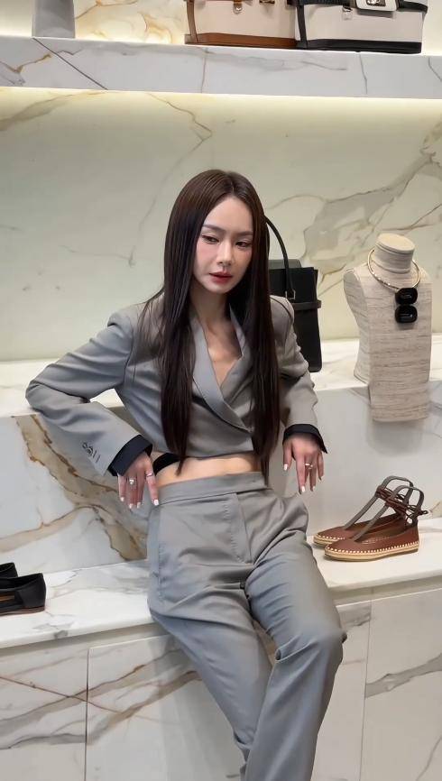 戚薇当天穿了一身灰色短款西服套装,走的还是她一贯的酷飒路线。短款上衣露出平坦小腹,能看出身材管理一直在线,即便坐下也几乎看不到赘肉。