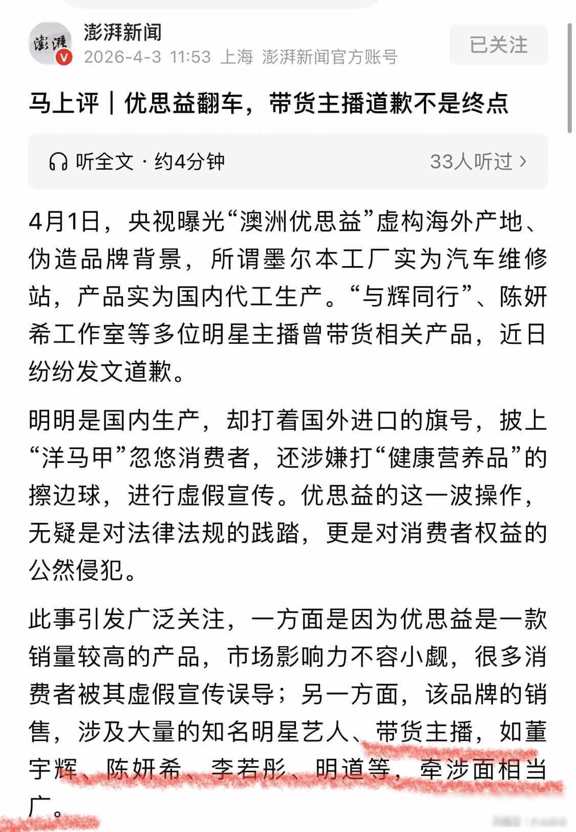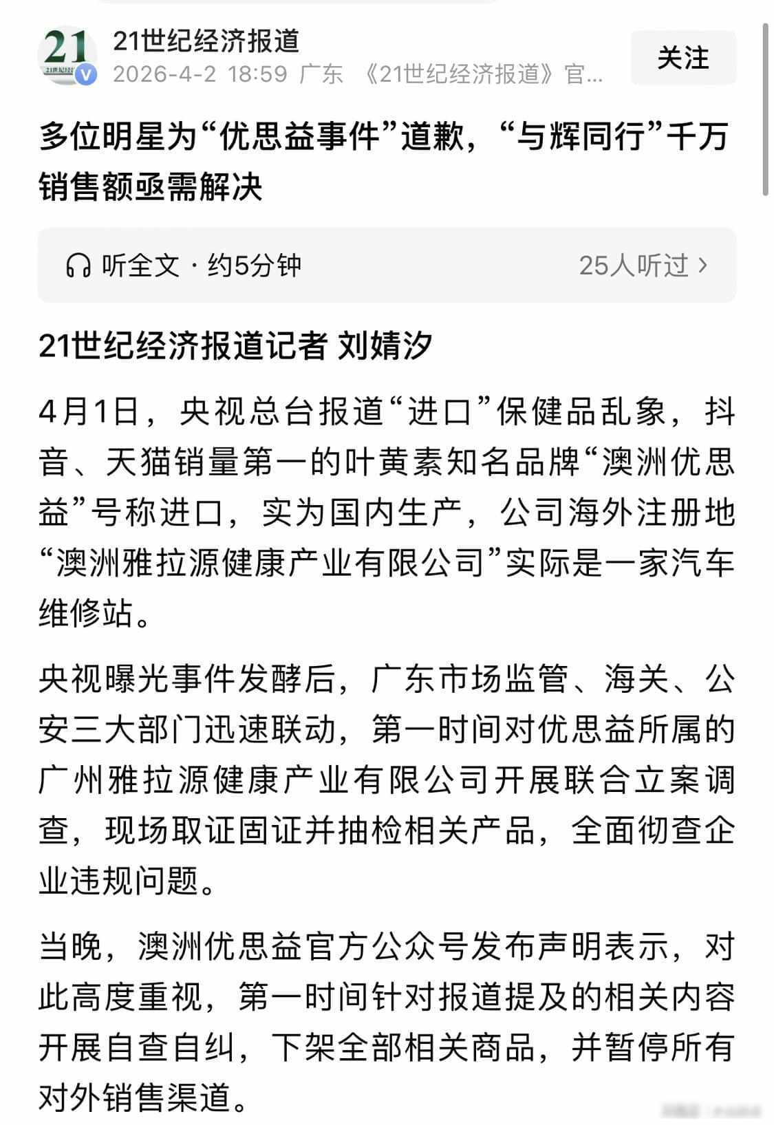 这次清空和一个叫“优思益”的保健品直接相关,央视最近报道了这个品牌,说它自称“澳洲原装进口”,实际上产品是在国内小工厂代工生产的,那个所谓的墨尔本总部,查出来是个汽车修理铺子,那些国际认证和专家推荐,全是编造出来的,这明显是典型的“假洋牌”,靠包装来忽悠消费者,这个产品在董宇辉的“与辉同行”直播间卖得特别火,销售额超过千万,订单接近十万单,成为主推爆款之一。