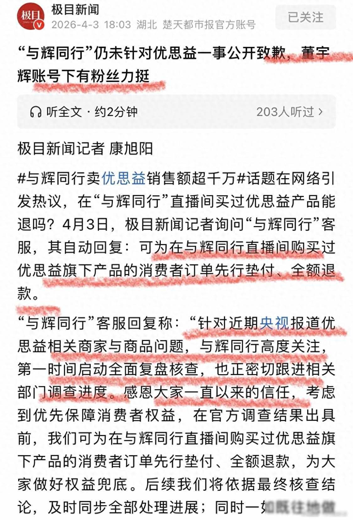 事情闹大后,其他合作的明星比如李若彤和明道都赶紧出来道歉,还答应先赔钱给消费者,但“与辉同行”只让客服发了个支持退款的通知,董宇辉本人一直没露面也没说话,大家开始觉得不对劲,以前董宇辉总说自己重视诚信坚持底线,讲究文化不乱卖东西,现在出了这么大的事反而躲着,很多人心里就咯噔一下。