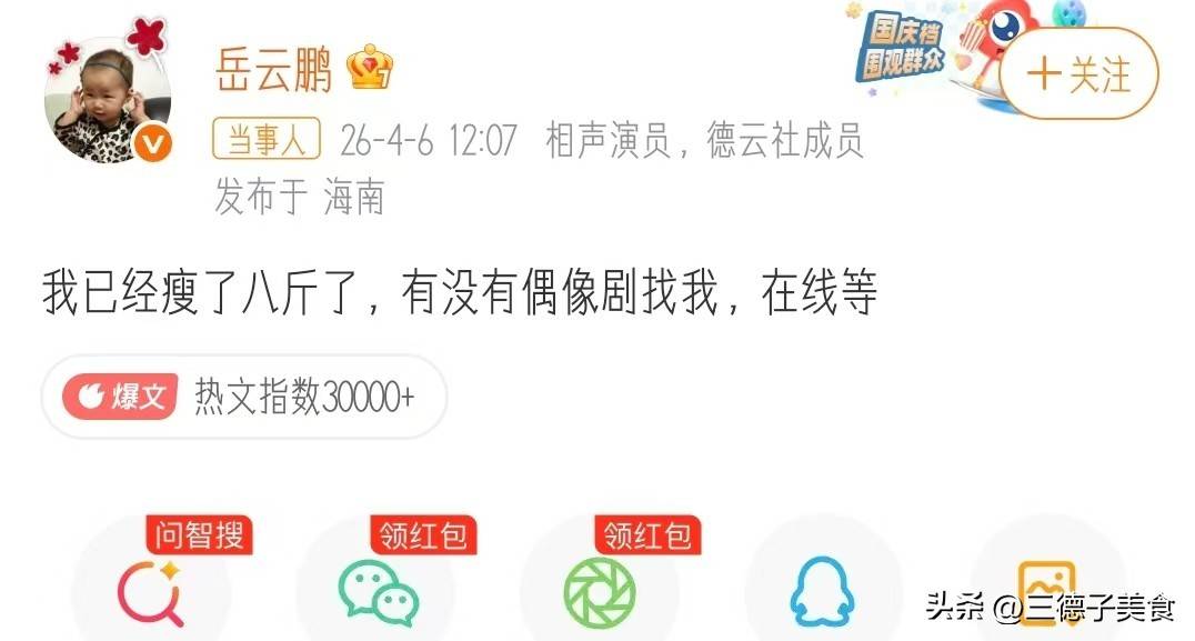 结果今年4月初,他就在微博晒了瘦8斤的消息,不少网友听到这消息都懵了,一开始还以为小岳岳是在开玩笑。