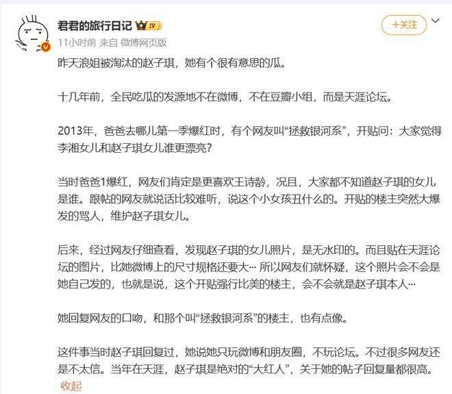 就在这股萌娃热潮里,天涯论坛突然冒出一个ID叫 “拯救银河系” 的楼主,发帖抛出灵魂拷问:“李湘的女儿和赵子琪女儿,两个胖嘟嘟的小娃你觉得谁更漂亮?”