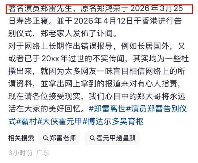 从公开的讣告中可以发现,郑雷本名郑鸿荣是在3月25号去世的,追悼会则定在4月12号,也就是今天,明天上午举行大殓,届时郑雷将正式告别这个世界。