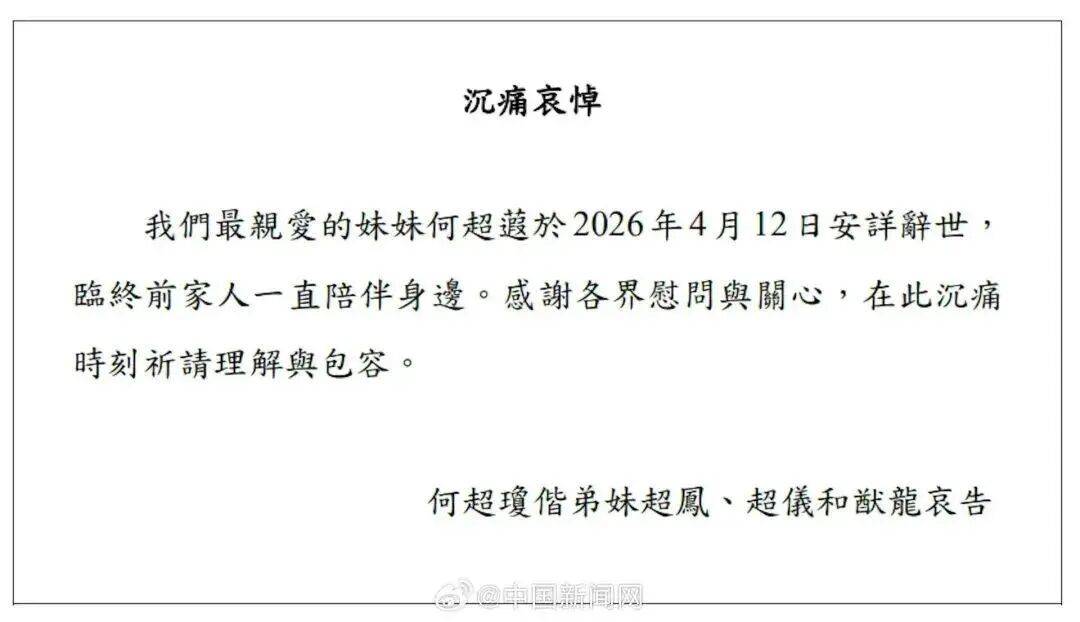 信德集团发布讣告,证实执行董事何超蕸于当日安详辞世,终年60岁。何超琼、何超凤、何超仪、何猷龙四位胞弟妹联合署名,以“我们最亲爱的妹妹”称呼她。据港媒报道,临终时家人都陪伴在侧。