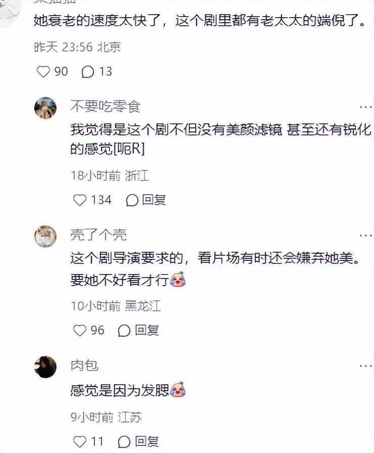 她在剧里的面部状态也很沧桑,眼窝和嘴角都出现了老态,头发还毛毛糙糙的,形象毁的很彻底,劝退了一些观众。
