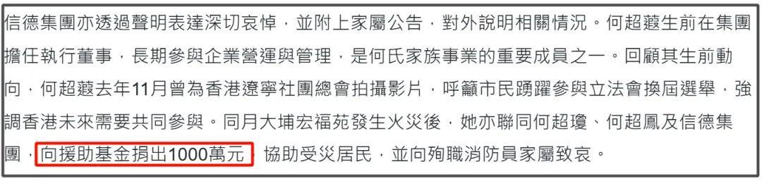 何超蕸也承继父志,致力于慈善事业,此前的香港火灾,信德集团也捐出一千万救灾,善举非常多。不过何超蕸一生未婚未育,专注于协助姐姐们管理企业,姐妹感情也是很好。