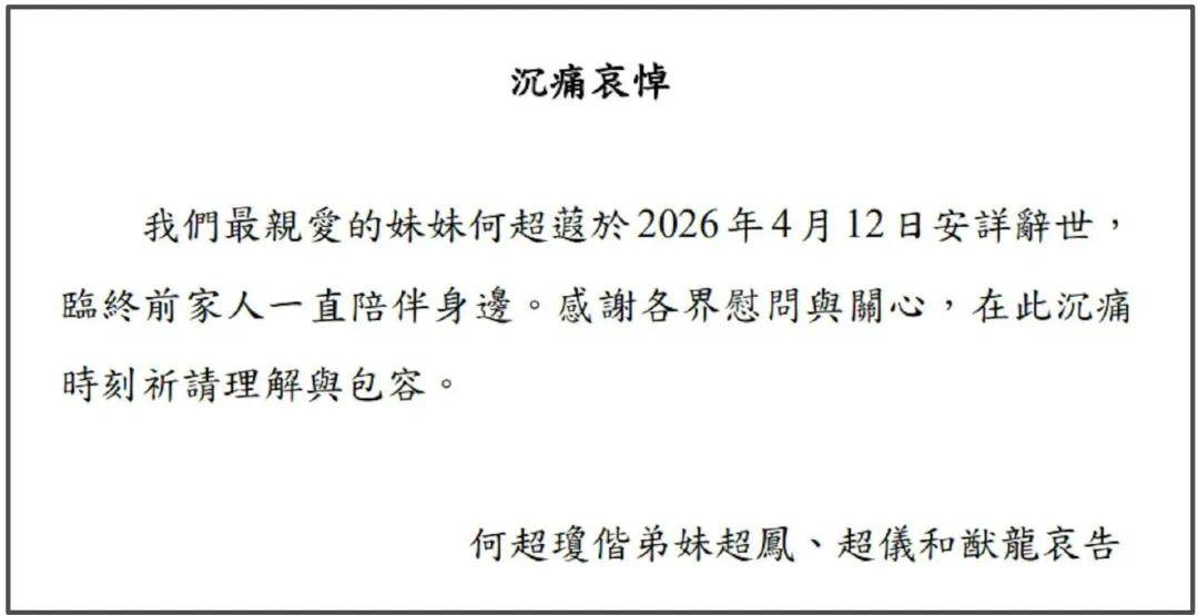 4月12日,港媒报道赌王女儿何超蕸去世,享年60岁。何超琼和弟弟妹妹一同发布讣告,宣布妹妹离世,提到临终前家人一直陪伴在身边。