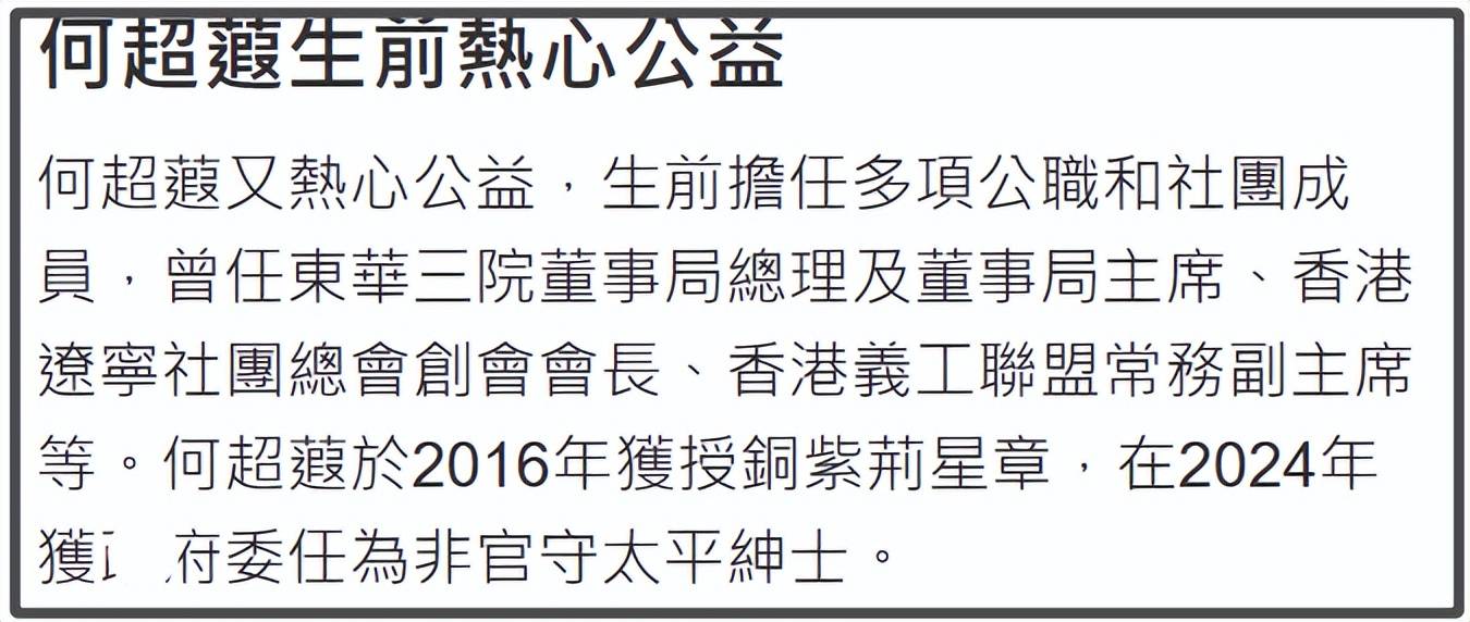 何超蕸生前担任信德集团执行总裁,而信德集团正是赌王三大核心资产之一,除此之外,何超蕸还是宏海控股的执行董事及主席、香港中商会的会董。还曾在2016年被授予铜紫荆星章,别看她低调,但身上的荣誉可一点也不少。