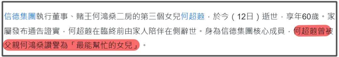 4月12日,港媒报道赌王女儿何超蕸去世,享年60岁。何超琼和弟弟妹妹一同发布讣告,宣布妹妹离世,提到临终前家人一直陪伴在身边。据港媒爆料,何超蕸生前患有乳腺癌,和癌症对抗多年,但