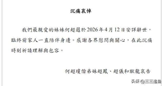 4月12日,赌王千金何超琼发讣告,自己的妹妹何超蕸因病离世,享年60岁,当天何超琼带着妹妹何超凤、何超仪,弟弟何猷龙一直陪在何超蕸身边,送妹妹最后一程。
