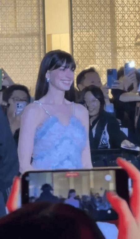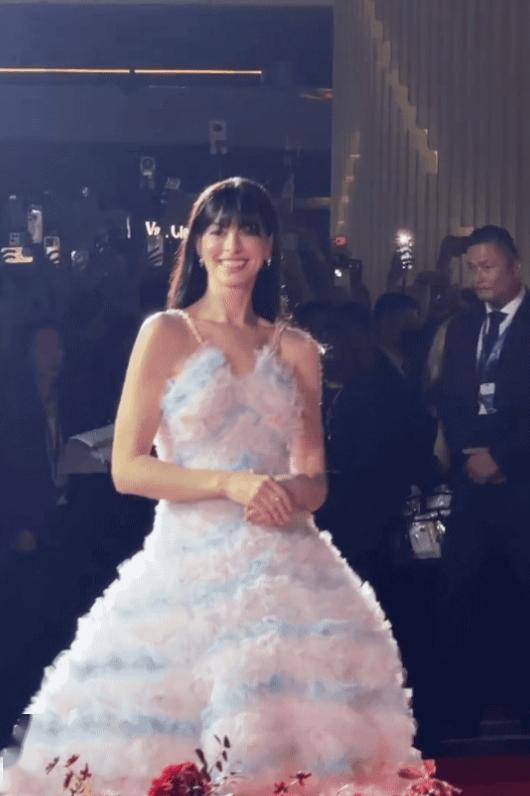 44岁的安妮・海瑟薇身着中国设计师方妍楠的粉蓝色绉纱蓬蓬裙,搭配水晶鞋,活脱脱现实版公主,一出场就引发全场尖叫。