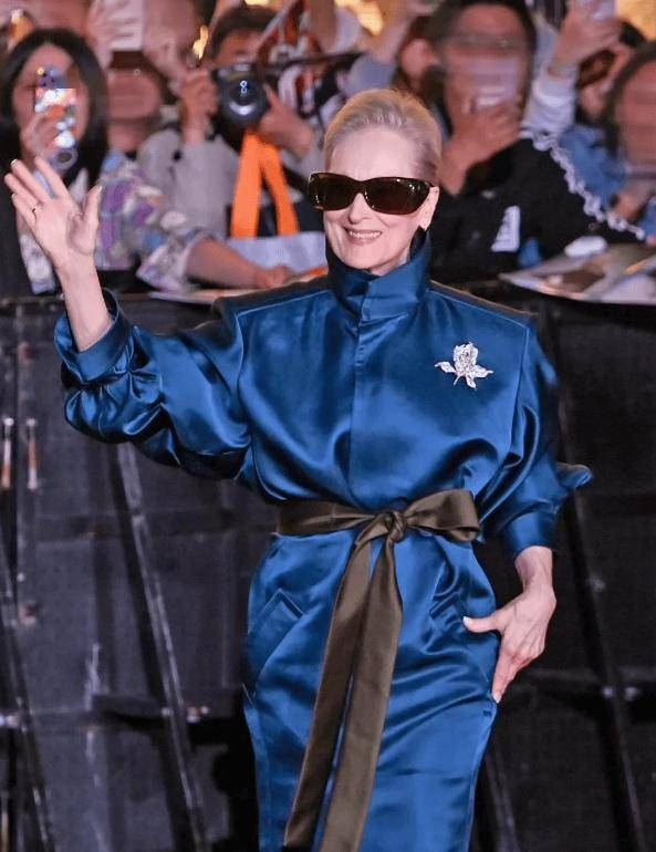 而当77岁的梅丽尔・斯特里普登场时,现场的氛围直接被推向高潮。她身穿圣罗兰孔雀蓝亮面风衣款礼服,黑色蝴蝶结腰带勾勒出挺拔身姿,银发利落扎起,搭配华人珠宝设计师赵心绮的艺术珠宝,举手投足间全是 “时尚女魔头” 米兰达的影子。