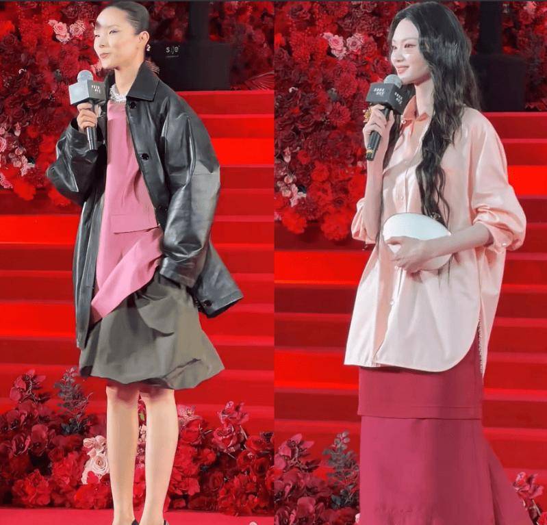 雎晓雯则反其道而行之,皮衣混搭廓形裙,俏皮中带着酷劲,不愧是时尚圈的 “鬼马精灵”。