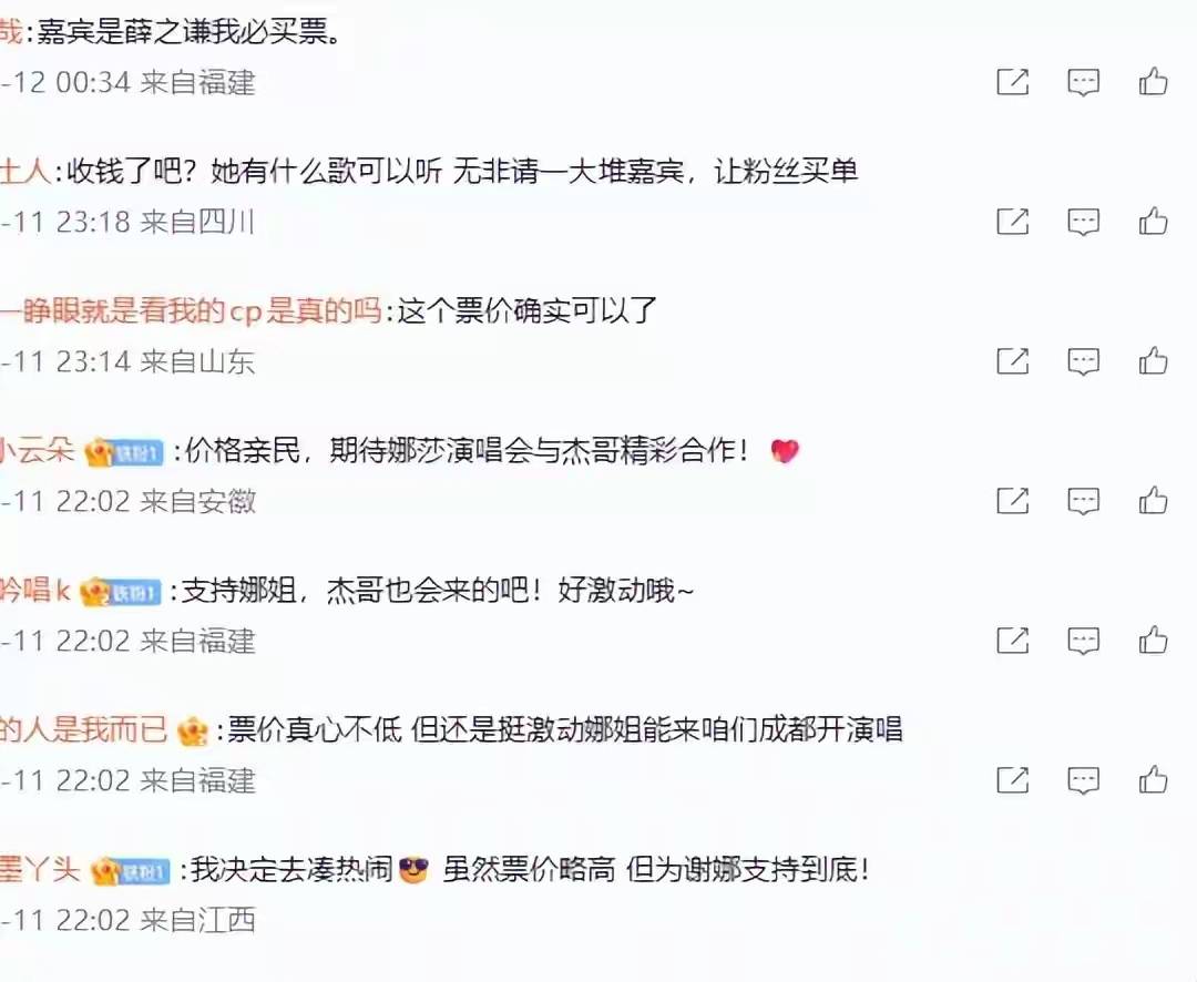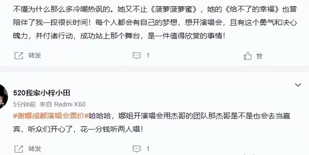 有人觉得1180元票价太高,林忆莲和Ella这些实力唱将的顶级场次也只卖980元,谢娜的代表作只有《菠萝菠萝蜜》和《娜写年华》几首,连撑满两小时演唱会都勉强,还有人提起她没发行过正式专辑的事,认为她靠综艺热度开演唱会是在占便宜。
