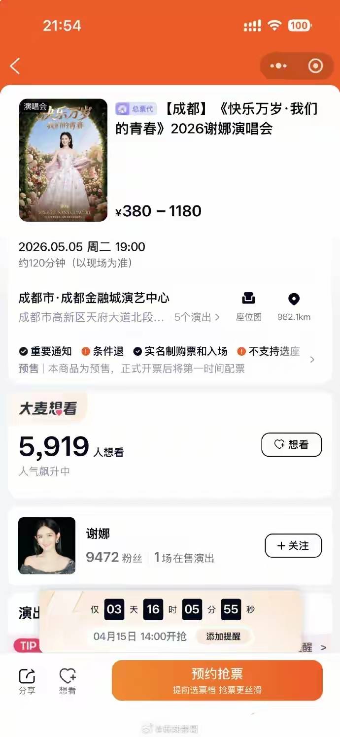 4月11日晚上,《乘风2026》直播快结束的时候,谢娜眼睛红了,她告诉大家人生第一场个人演唱会定在5月5日,地点选在成都金融城演艺中心,消息一出不到半天,“想看”的人数就