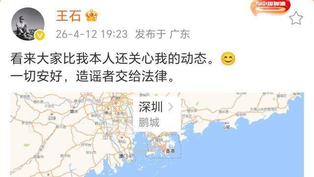 随后,王石也现身回应“看来大家比我本人还关心我的动态。一切安好,造谣者交给法律”。他还分享了地址——深圳鹏城。