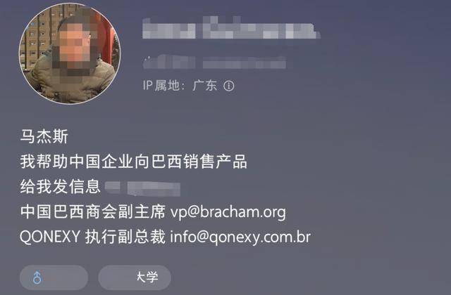 而翻看博主的社交资料发现,他是中国巴西商会副主席、QONEXY执行副总裁。早在今年3月初,他的IP就显示在广东。