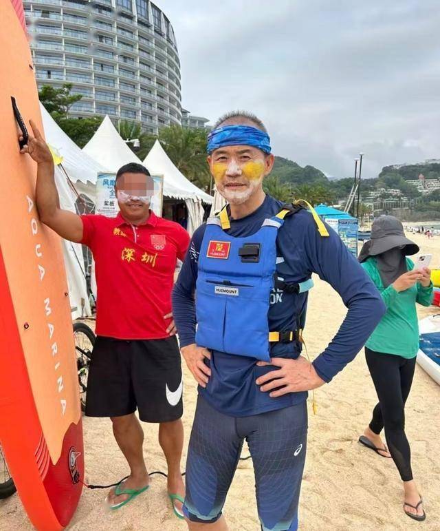 另外一张是他在沙滩上的留影。照片里,他裹着一条蓝色的头巾,脸上涂了白色、黄色的颜料,身穿蓝色长袖泳衣和短裤,外搭救生衣,双手插在腰间,看起来精气神十足。