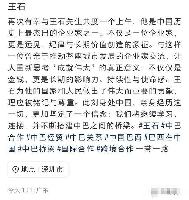 梳理发现,就在同一天,有博主分享了王石的动态。博主说,“再次有幸与王石先生共度一个上午”,夸他是杰出的企业家。值得注意的是,博主的发帖地址显示在深圳,与王石分享的对得上。