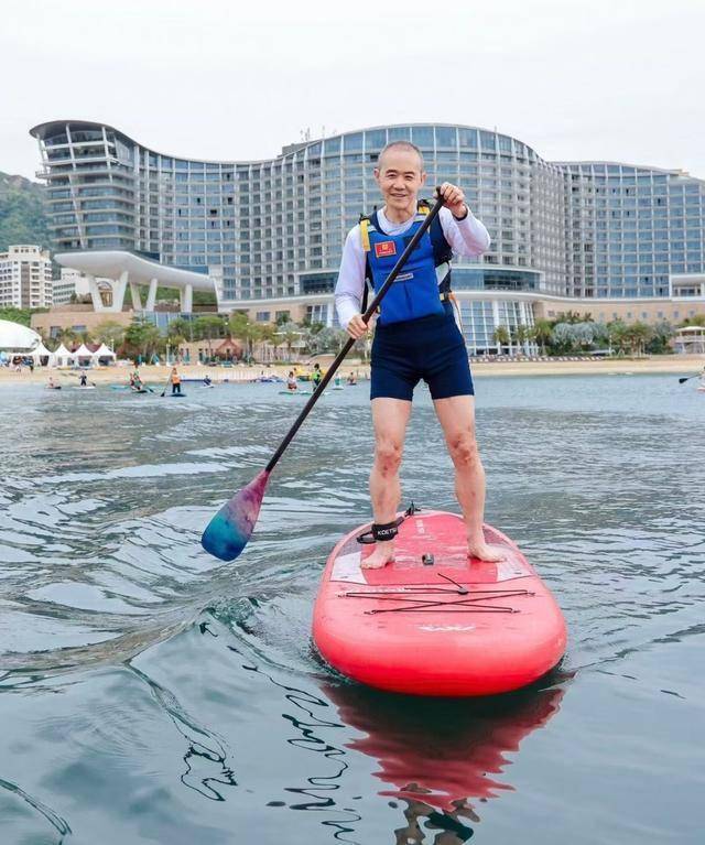 还有一张是他划帆船的留影。照片里,他脚踩红色帆船,手里拿着桨,皮肤白皙,满面笑容,一点看不出是已经75岁的人,说57岁也有人信啊。