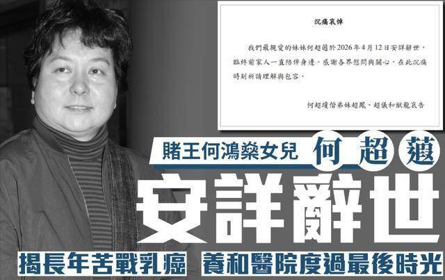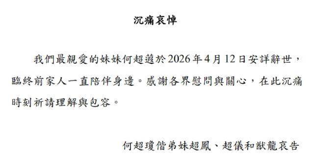 “我们最亲爱的妹妹何超蕸于2026年4月12日安详辞世,临终前家人一直陪伴身边。感谢各界慰问与关心,在此沉痛时刻祈请理解与包容。”