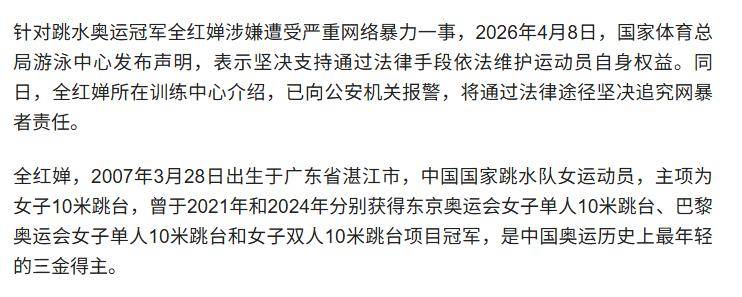 今年4月8日,针对全红婵涉嫌遭受严重网络暴力这件事情,国家体育总局游泳中心发布了一份声明。