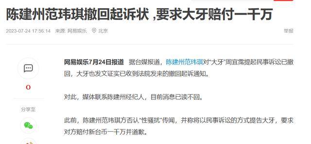 眼看风向不对,到了2023年7月24日,范玮琪和陈建州又灰溜溜地把对大牙的起诉给撤了。