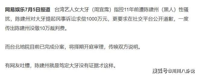 2023年陈建州被大牙控诉性骚扰,范玮琪发文力挺“正直”,夫妻俩起诉大牙索赔1000万。