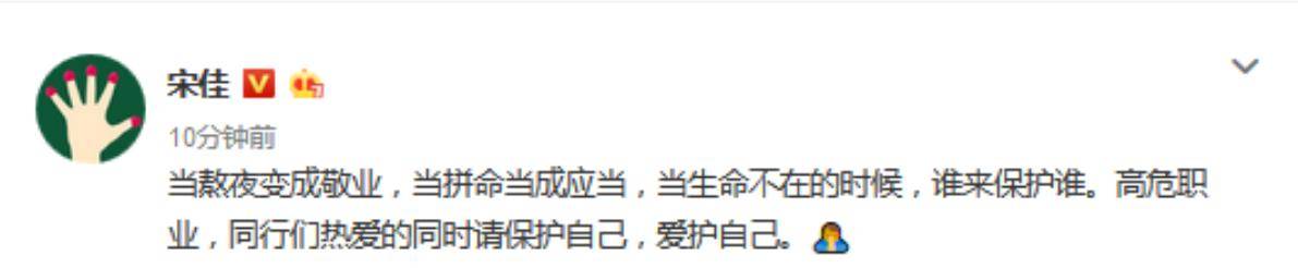 同年11月,演员高以翔猝逝,宋佳发微博说“当熬夜变成敬业,当拼命当成应当……演员是高危职业”,被网友群嘲:拿着高片酬,怎么好意思说“高危”?