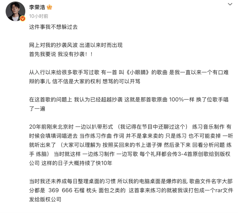 而除了《小眼睛》这首歌,其他被指控抄袭的歌,李荣浩拒不承认:“就算打死我、骂死我,我也不认。”
