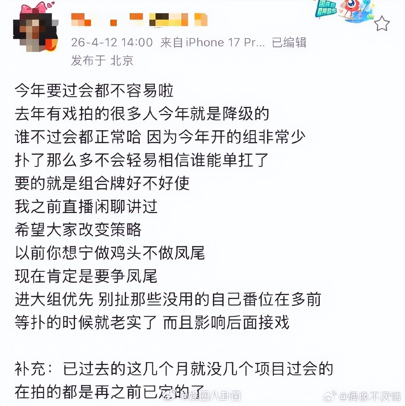 内容为有博主透露,今年要过会都不容易了,去年有戏拍的很多人今年就是要降级的,谁不过会都正常,因为今年开的组非常少。扑了那么多不会轻易相信谁能单扛了,要的就是组合牌好不好使,以前你想宁做鸡头不做凤尾,现在肯定是要争凤尾,进大组优先,别扯那些没用的自己番位在多前,等扑的时候就老实了,而且影响后面接戏。