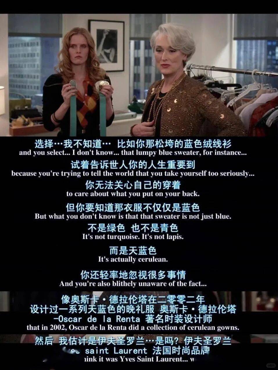 想起时尚电影《穿Prada的女魔头》里,有一段经典的“蓝色毛衣理论”: