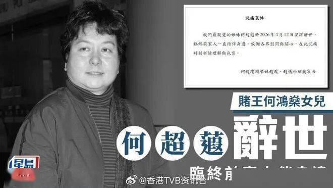 4月12日的香港豪门圈,被一则噩耗砸得有些懵 —— 赌王何鸿燊二房三女何超蕸,在养和医院安详离世,享年60岁。消息刚出来时,信德集团官网直接换成黑白底色,何家兄弟姐妹