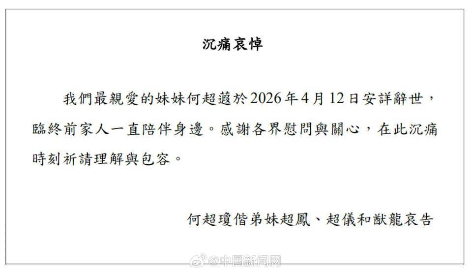 4月12日,赌王何鸿燊二房三女儿何超蕸的离世消息,让全网陷入唏嘘。信德集团官网变黑白色调,何超琼、何超凤等兄弟姐妹联合发布讣告,确认这位60岁的豪门千金安详辞世,临终前家人始