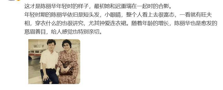 这位博主配着一张老照片振振有词:“这才是陈丽华年轻时和迟重瑞的合影!短发富态有旺夫相,穿衣讲究爱穿连衣裙,越老越慈眉善目~”