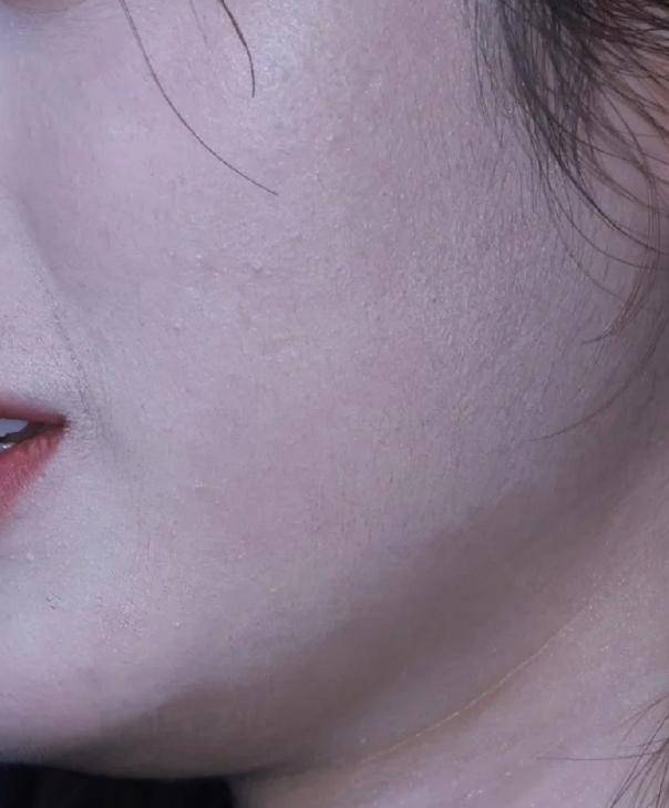 哪怕是近距离的怼脸镜头,也看不出一丝粉底黏腻的痕迹,根本就接近于没有粉,连咬肌隆起的痕迹都能看得清楚。