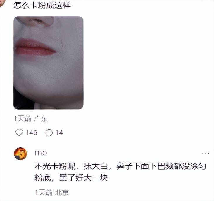 而且,因为她脸上粉底画的太重,看着像是多刷了一层腻子,皮肤都分层了,卡粉也格外严重。