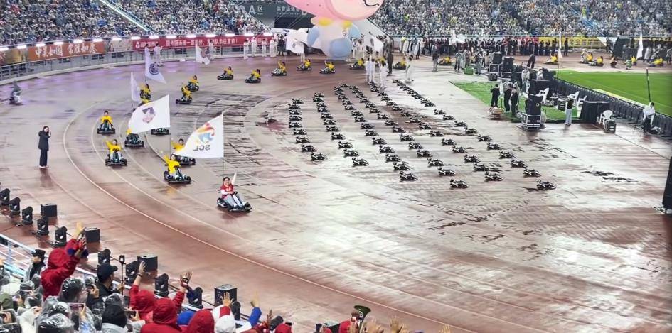 除了机器人的硬核炫技,开幕式同样是一场融合盛宴。周深空灵献唱主题曲,无人机编队如繁星点亮雨夜,卡卡丁车方阵酷炫登场,共同将现场氛围推向顶点。有网友称赞:“省级联赛开幕式,排面比世界杯还燃”。