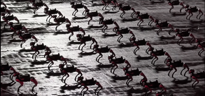 当晚,尽管天公不作美,现场依旧座无虚席。而将气氛推向顶点的,绝非传统歌舞——而是一支由290台本土研发的四足机器狗与人形机器人组成的未来感方阵。在湿滑的草坪上,这支“钢铁军团”上演了零失误的同步舞蹈与精密队形变换,银色机身精准切割着雨幕与灯光,科技感直接拉满。这波操作被网友戏称为“赛博开幕式”,排面十足。