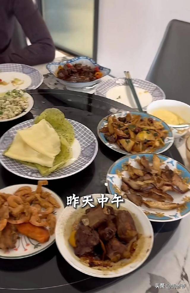 可谁也没想到,这些看着丰盛的饭菜,全是前一天和洪晃聚餐打包回来的剩菜,就连隔夜青菜都舍不得扔,继续端上餐桌。