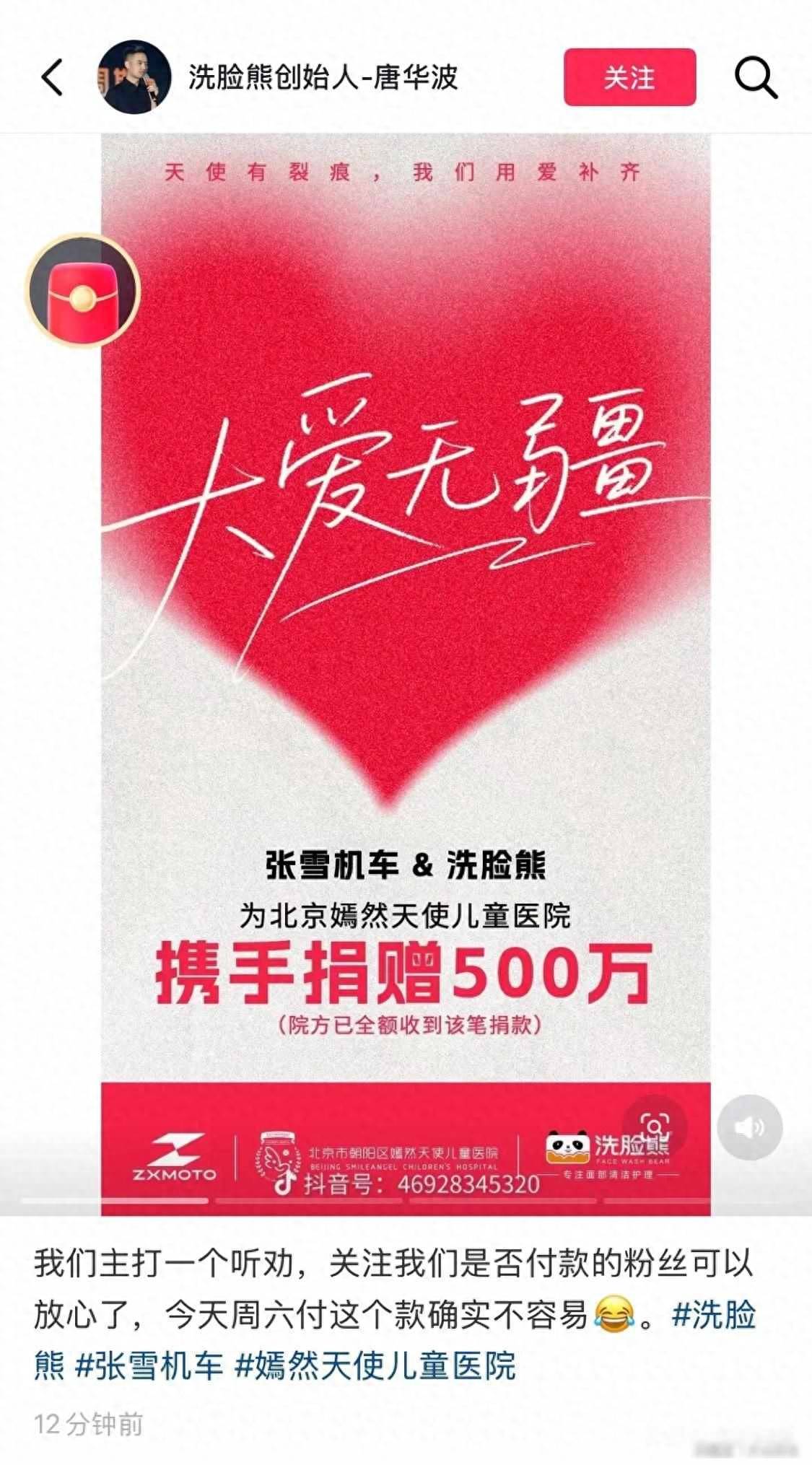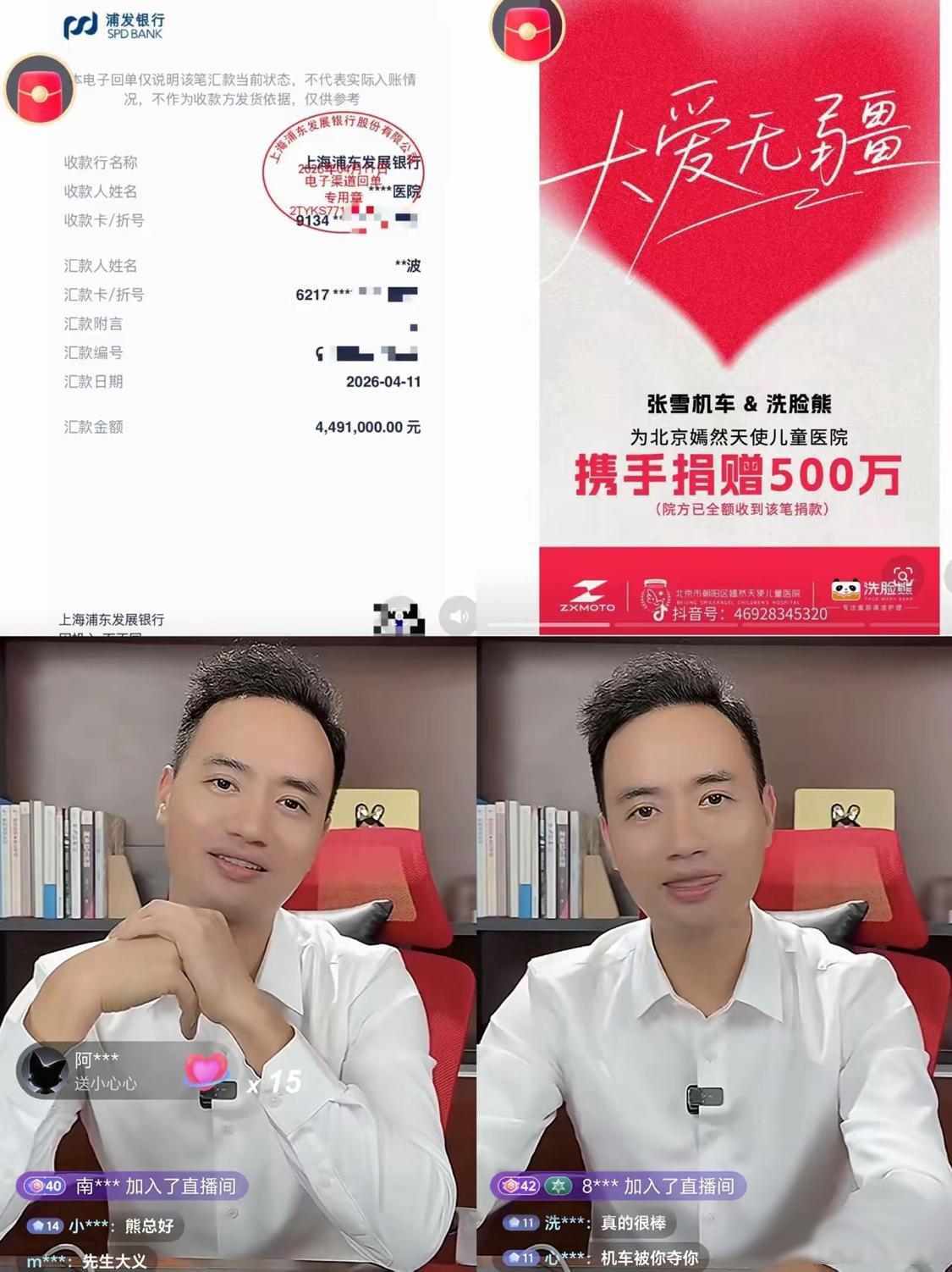 4月11号晚上,洗脸熊老板唐华波发了张电子回单,显示500万元已经转进北京嫣然天使儿童医院的账户,这件事起因是前一晚的拍卖——WSBK赛车冠军张雪拿出自己夺冠赛车的1:1复刻版来卖,说全部收入要捐给唇腭裂患儿,结果拍到500万时中标人叫“敌敌畏137”,一看就是网名,后来查出是洗脸熊的员工,大家就议论是不是老板自己出钱买回去再假装捐款。