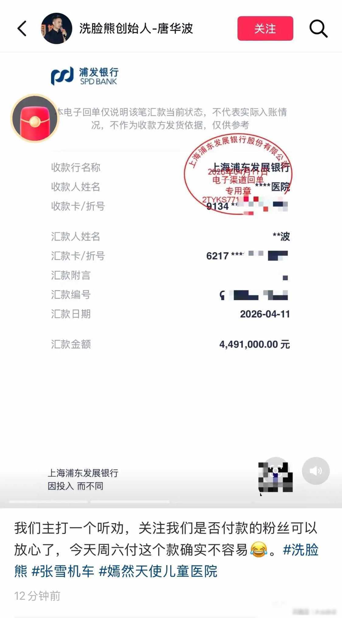 4月11号晚上,洗脸熊老板唐华波发了张电子回单,显示500万元已经转进北京嫣然天使儿童医院的账户,这件事起因是前一晚的拍卖——WSBK赛车冠军张雪拿出自己夺冠赛车的1